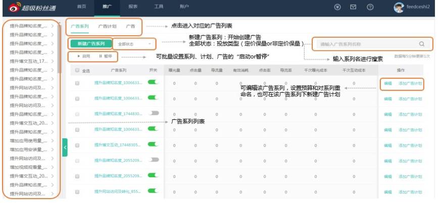 超级粉丝通是以营销目的为导向,广告系列即老粉丝通的广告组,一个广告系列 只能对应一个营销目的,一个广告系列下可以建多个计划,一个计划下最多可创建 5 组创意。