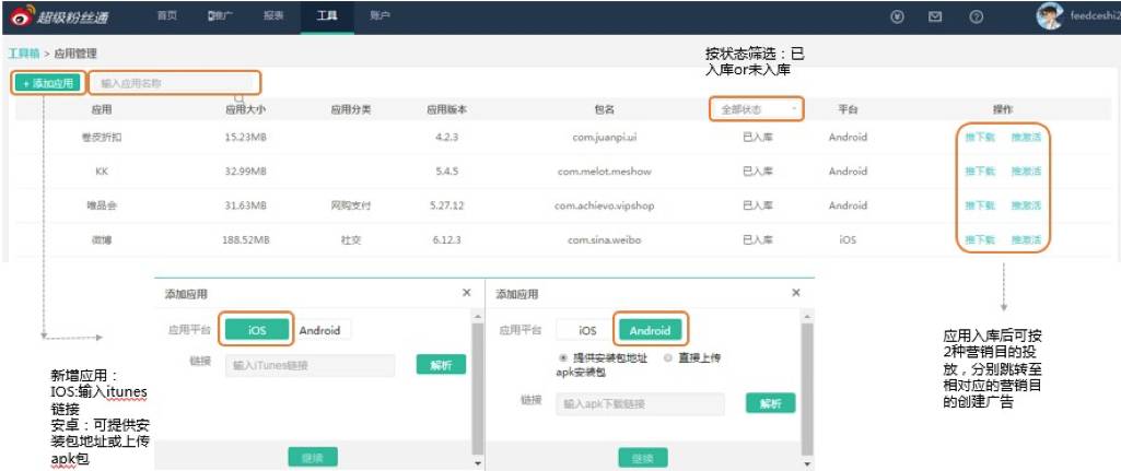 3、应用管理:新增应用,适用于应用类广告主将APP入库。