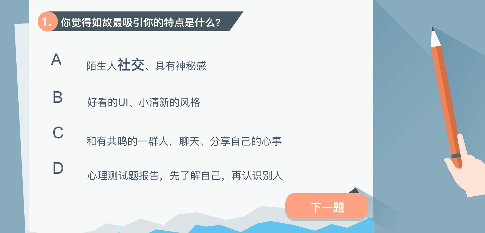 一般人都会认为如故比较偏小清新风格吧,第一题会选“B”,然后投放上,社交类应用都会选择美女帅哥,第二题会选“A”。