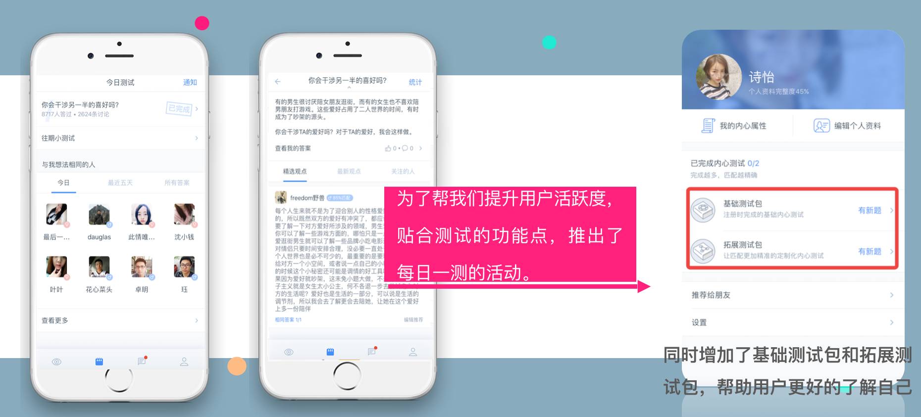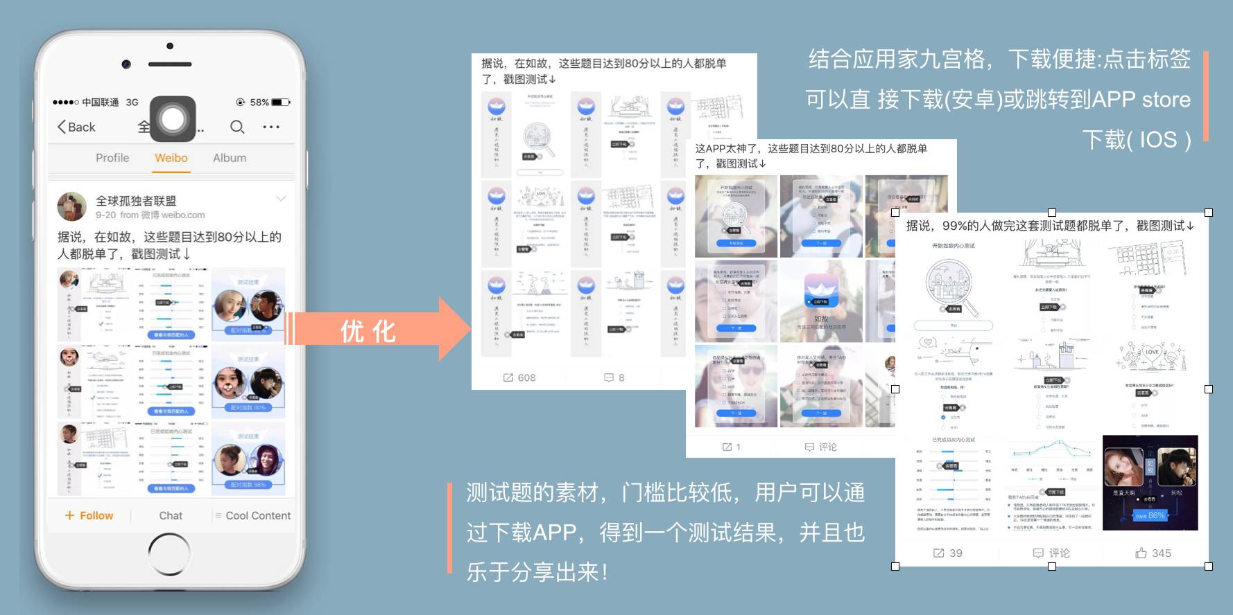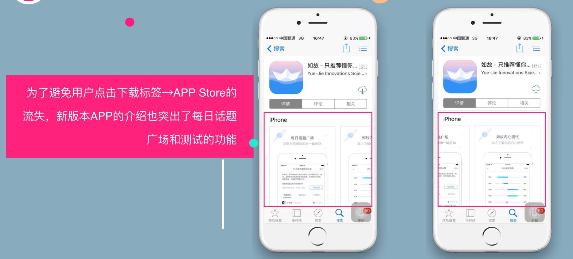 A:首先创意肯定是在深度使用产品以后提出来的,它必须和产品有很强的关联性。我们的创意是“年轻人的测试”,那么我们就在产品内增加“每日一测”的活动;在APP Store 增加“测试功能”介绍页。
