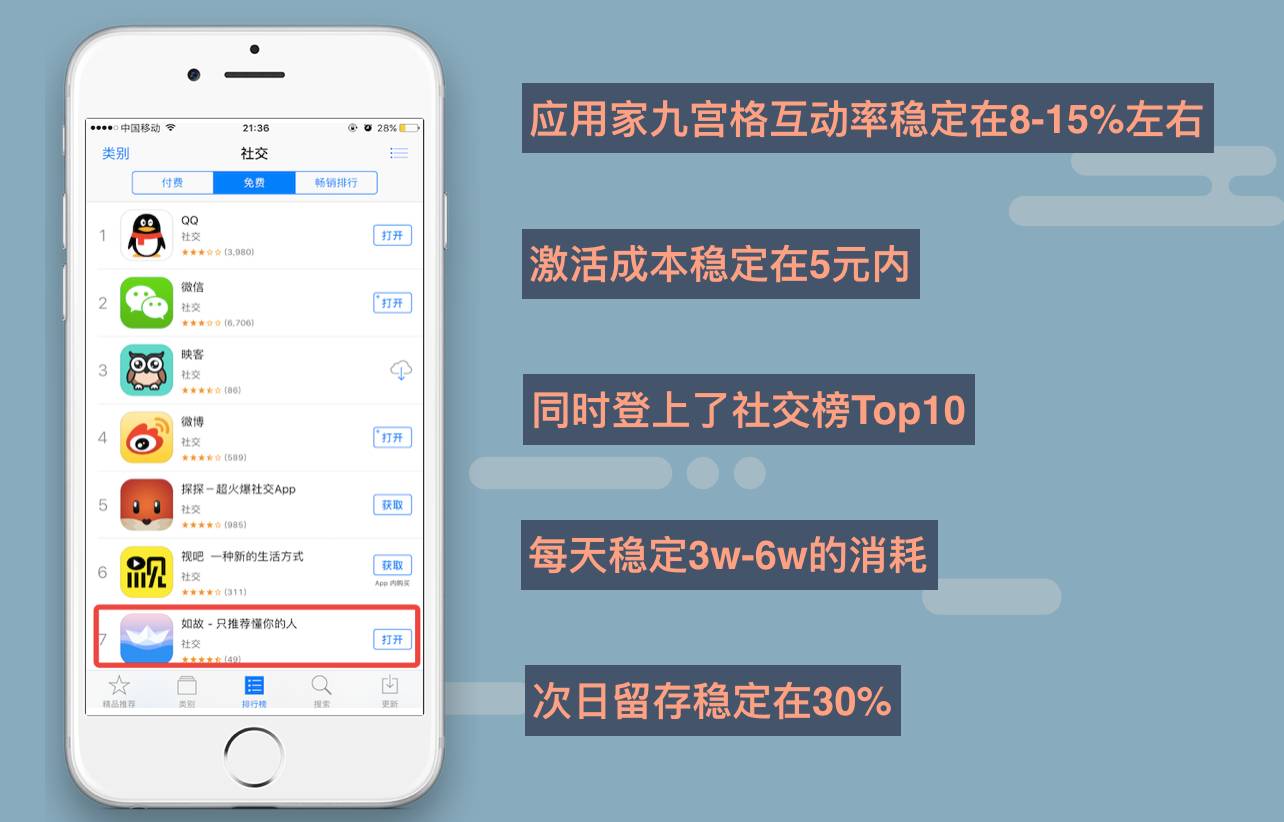 A:通过大家共同努力,如故最终登上了社交榜Top10,次日留存稳定在30%。