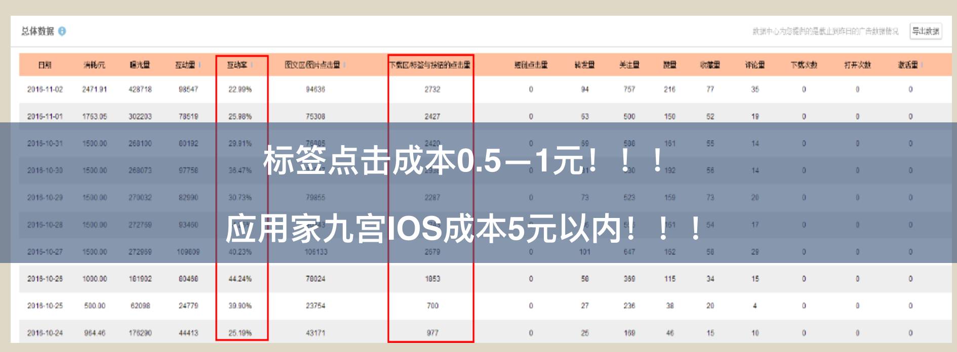 A:后期效果很不错,标签点击成本降到了0.5-1元,应用家九宫格IOS成本控制在了5元以内。