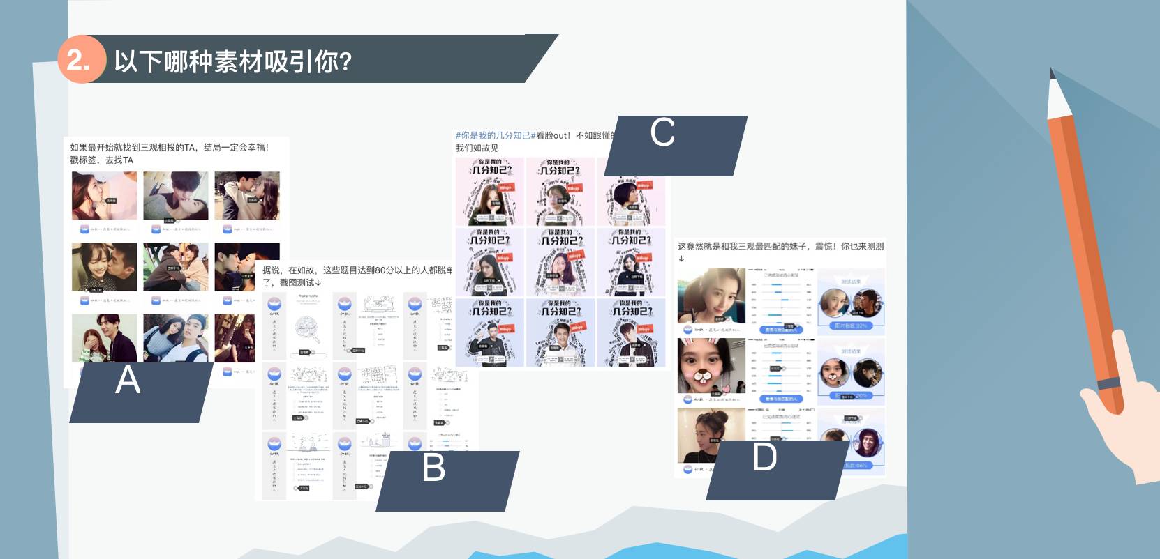 2、从“热点追随者”这点分析来讲,素材创意的“D”选项才是最为受众所接受的。