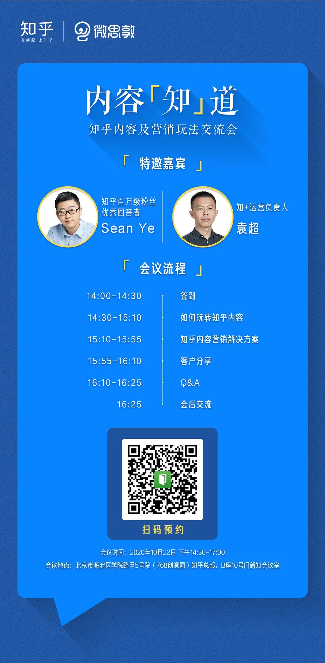 为了解答上述问题,10月22日微思敦&知乎专场北京沙龙会:内容「知」道——知乎内容及营销玩法交流会,为您一一揭晓答案!知+业务运营负责人及知乎百万粉丝优秀回答者与你面对面探索内容「知」道!